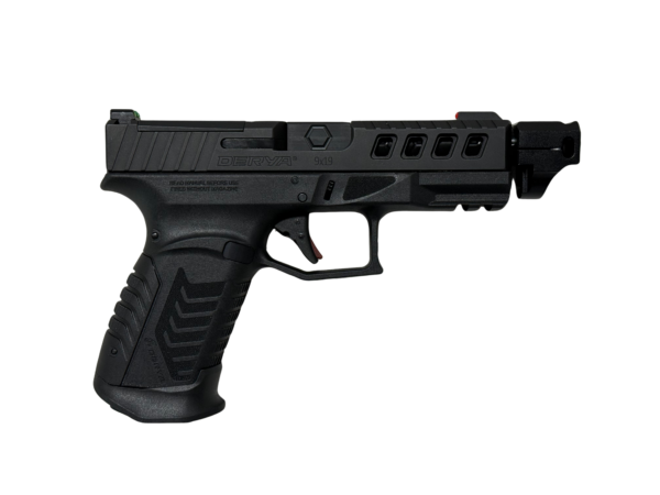 Derya DY9 Comp, Striker Fired, Semi-automatic, Polymer Frame, Full Size, 9MM, 4.56" Threaded Compensated Barrel, Melonite Finish, Black, Truglo Fiber Optic Front and Rear Sights, Optics Ready Slide, Glock Magazine Compatible, 15 Rounds, 1 Magazine, Includes (2) Optic Plates & (4) Back Straps DY9.COMP.US