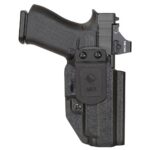 Mission First Tactical’s AIWB Holster is capable of use both Inside the Waistband/Appendix (IWB) Outside the Waistband (OWB) in both right & left-hand positioning. Each holster is handmade to precise tolerances for each model of handgun using the most advanced techniques and materials for an all-day comfortable carry. Adjustable retention and the famous “audible click” makes each draw and re-holstering smooth and secure ideal for Concealed Carry. Holsters include a 1 ½” Belt Clip a Comfort Carry Paddle can be purchased separately for OWB carry.